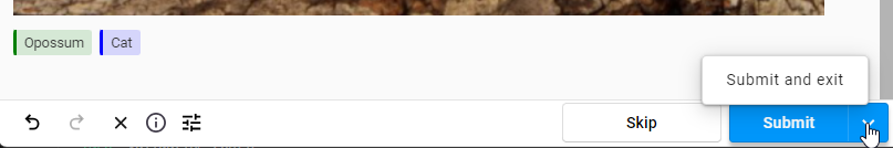 If you are not finished but would like to exit the labeling stream (for example, to pause the lead time calculation), you can click the drop-down menu next to Submit and then select Submit and Exit (or Update and Exit). This will submit the current annotation and allow you to exit the labeling stream.
