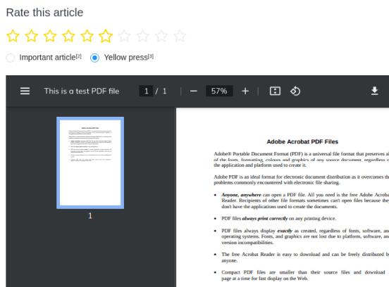 Use the Rating control tag to apply a star rating with a scale of 10 to the pdf:
